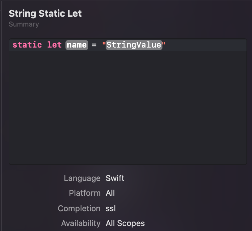 3. Xcode 에서 일반적으로 제공하는 Code Snippet 은 Place Holder 가 제공되고, place holder 는 <# name #> 을 사용하여 만들 수 있다.