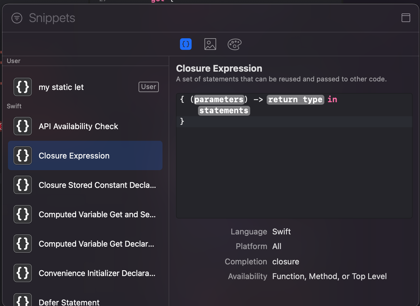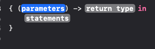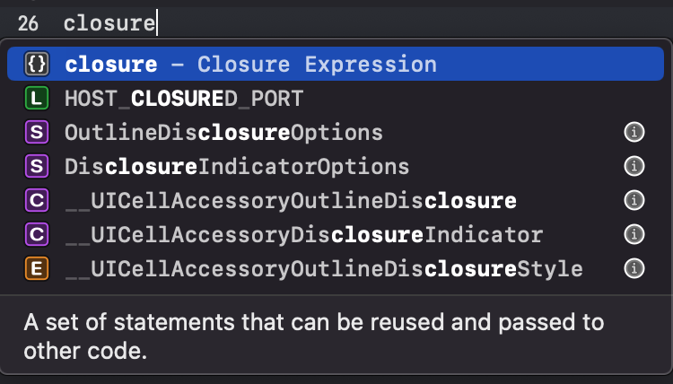 여기에 Completion 을 보면 'closure' 라고 쓰여있는데, 이는 XCode 에서 'closure' 을 입력 시 바로 코드를 완성 할 수 있다는 의미인 듯 하다.