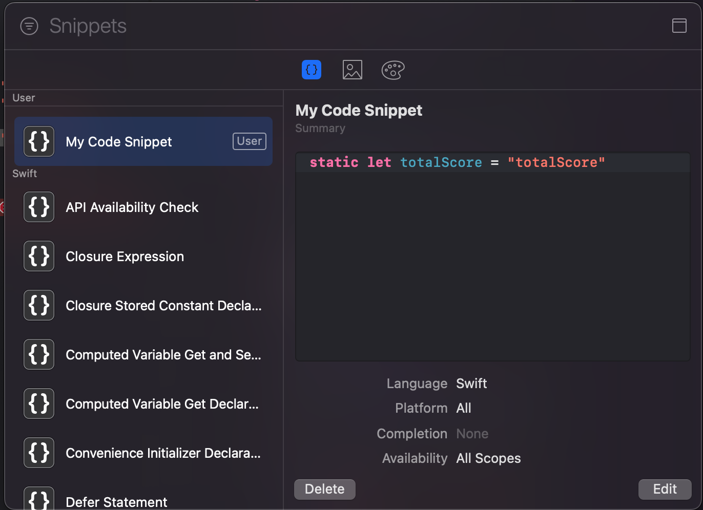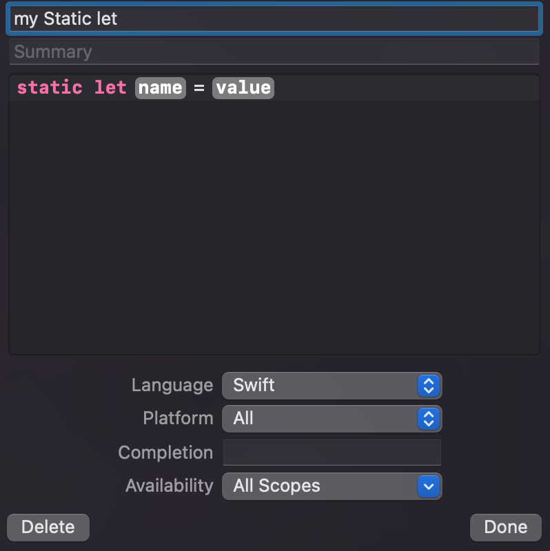 3. Xcode 에서 일반적으로 제공하는 Code Snippet 은 Place Holder 가 제공되고, place holder 는 <# name #> 을 사용하여 만들 수 있다.