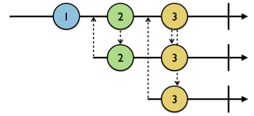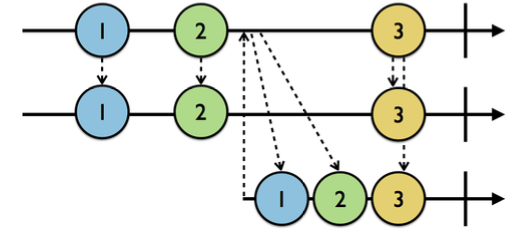 event 1, 2 가 잇따라 추가된 후, 나중에 세번째 Line 이 Subscription 을 하게되면 (2 이상의 size 를 지정해주었다고 가정) 이전 2개 이벤트가 바로 방출되게 된다.