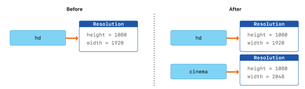 let hd = Resolution(width: 1920, height: 1080) var cinema = hd여기서 'hd' 를 Resolution instance(full HD, 1920 x 1080) 인 constant 로 선언해주었습니다. 그 후 'cinema' variable 을 선언하고 'hd' 의 현재 값으로 설정하였습니다. Resolution 이 structure 이기 때문에, 현재 instance 의 복사본이 만들어져 'cinema' 에 할당됩니다. 현재 'hd' 와 'cinema' 는 같은 값을 갖지만, 내부적으로는 전혀 다른 두 instances 입니다.