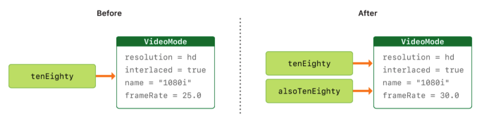 let alsoTenEighty = tenEighty alsoTenEighty.frameRate = 30.0Classes 는 reference types 이기 때문에, tenEighty 와 alsoTenEighty 는 사실상 같은 VideoMode instance 를 가리킵니다. 다시말하면, 이 둘은 같은 instance 를 갖지만 다른 이름을 가집니다.