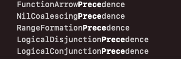 extension Vector2D { static prefix func +++ (vector: inout Vector2D) -> Vector2D { vector += vector return vector } } var toBeDoubled = Vector2D(x: 1.0, y: 4.0) let afterDoubling = +++toBeDoubled // toBeDoubled now has values of (2.0, 8.0) // afterDoubling also has values of (2.0, 8.0)Precedence for Custom Infix Operators