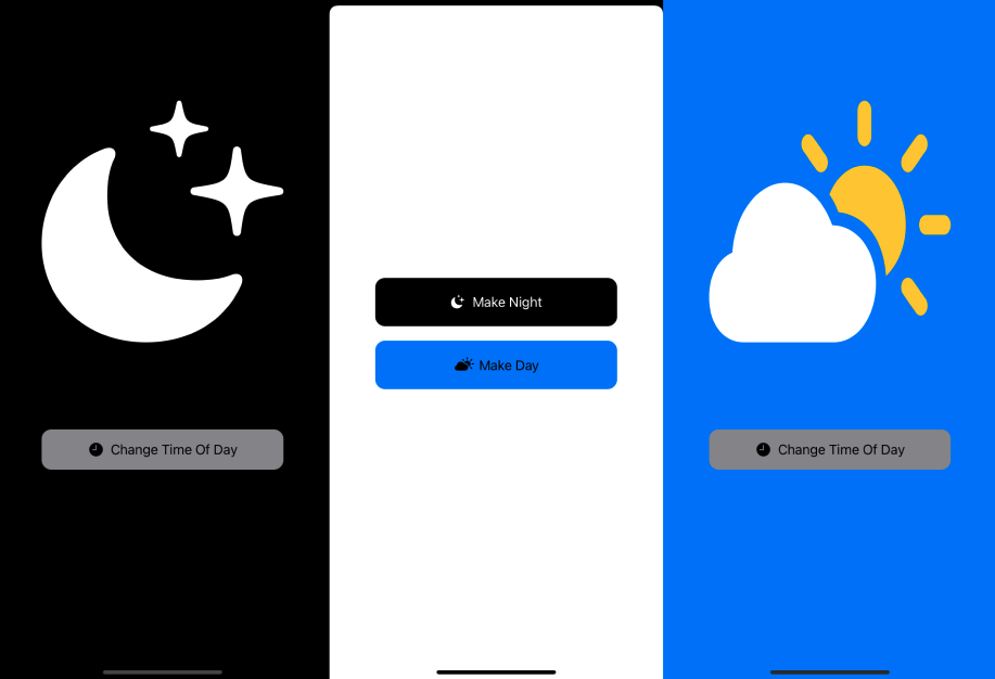 struct SimpleView: View { @State private var isNight = true @State private var isShowingSheet = false var body: some View { ZStack { VStack { Image(systemName: isNight ? "moon.stars.fill" : "cloud.sun.fill") Button { isShowingSheet = true } label: { Label("Change Time Of Day", systemImage: "clock.fill") .foregroundColor(.black) } } } .sheet(isPresented:$isShowingSheet, content: { SelectionView( isNight: $isNight, showingSelectionView: $isShowingSheet ) }) } }struct SelectionView: View { @Binding var isNight: Bool @Binding var showingSelectionView: Bool var body: some View { VStack { Button { isNight = true showingSelectionView = false } label: { Label("Make Night", systemImage: "moon.stars.fill") .foregroundColor(.white) } Button { isNight = false showingSelectionView = false } label: { Label("Make Day", systemImage: "cloud.sun.fill") } } } }Binding 의 첫 예제에서 화면을 나타나게 할지 말지는 설명했으므로 이번 예시에서는 isNight 변수 ( SimpleView 에서의 이미지 결정) 에 대해 알아보도록 해요.