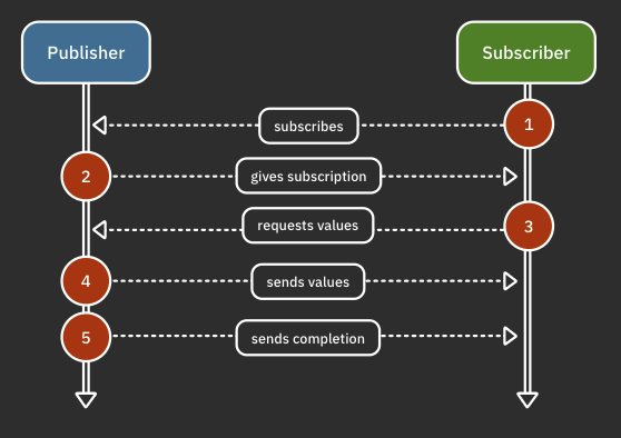 Publisher 는 0개 ~ 여러개의 values, 그리고 한개의 completion event (normal or error) 를 보냅니다. publisher 가 completion event 를 보내면 종료, 즉 그 후에는 어떠한 events 도 보낼 수 없습니다.